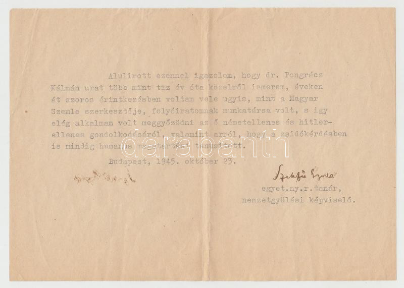 1945 Szekfű Gyula igazolása szerkesztőtársa, Pongrácz Kálmán részére, annak korábbi tevékenységéről