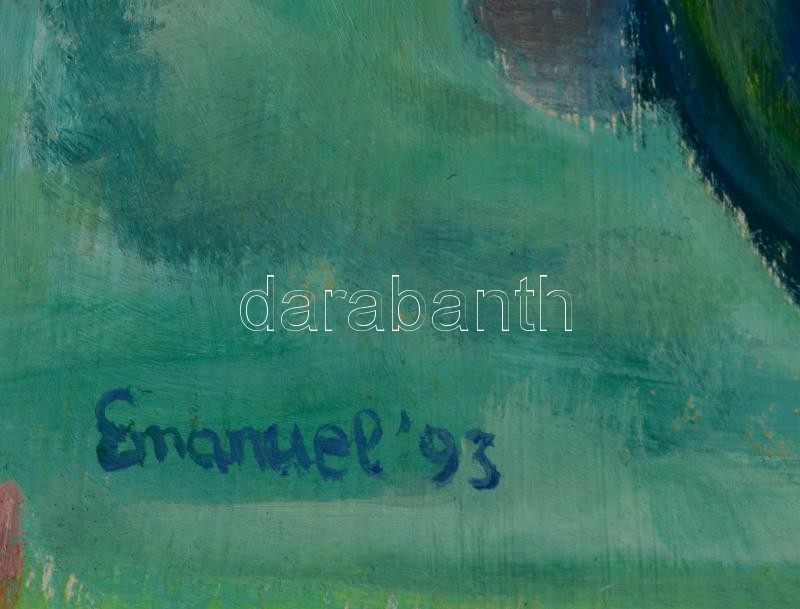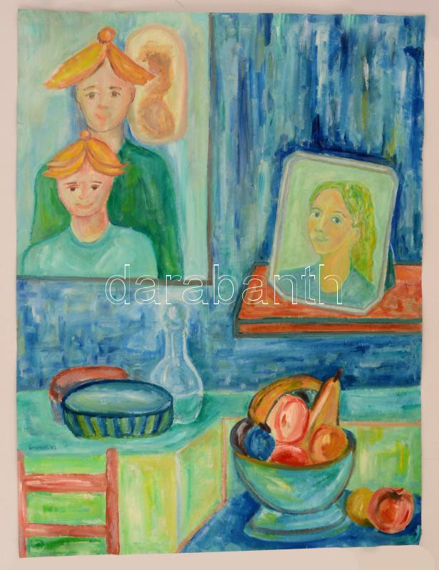Emanuel jelzéssel: Csendélet családtagokkal. Akril, papír, felcsavarva, 58×47 cm