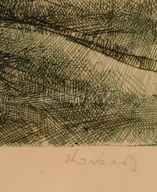 Kovács Júlia (1924-2007): Réten. Rézkarc, papír, jelzett, üvegezett keretben, 23×29 cm