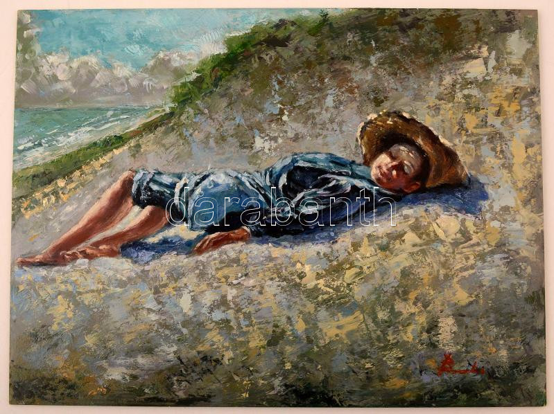 Olvashatatlan jelzéssel: Napfürdő. Olaj, farost, 30x40 cm