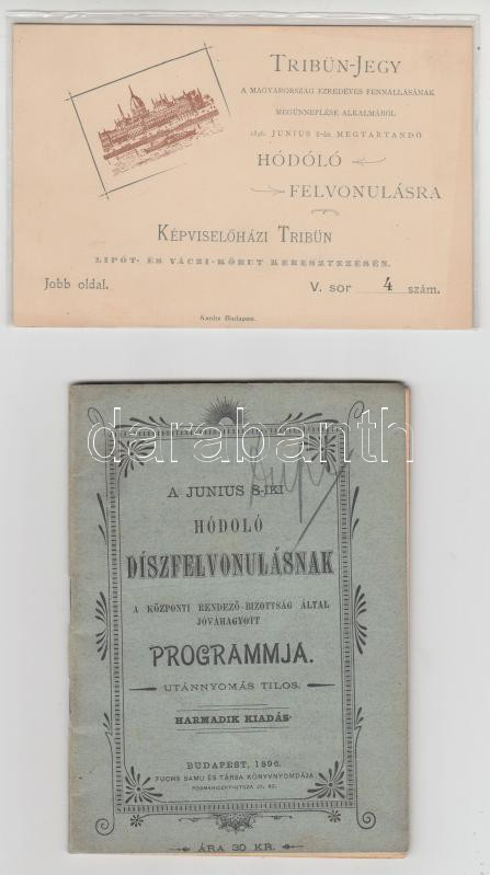 1896 Tribün-jegy a Magyarország ezredéves fennállásának megünneplése alkalmából tartandó hódoló felvonulásra + programfüzet, 55p