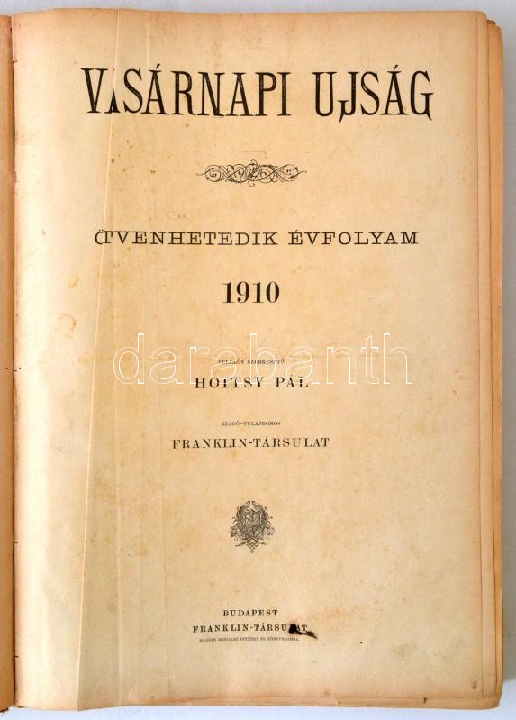 1910 Hotsy Pál (szerk.): Vasárnapi Ujság. 1910, 57. évfolyam, 1-26. sz... https://www.darabanth.com/en/282-Online-auction/282.0/Other-collectibles/Printed-Materials~10/1910-Hotsy-Pal-szerk-Vasarnapi-Ujsag-1910-57-evfolyam-1-26-szam-Toredek-evfolyam-~II1396396