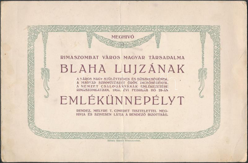 1926 Rimaszombat városának Blaha Lujza emlékünnepélyére szóló meghívó ...