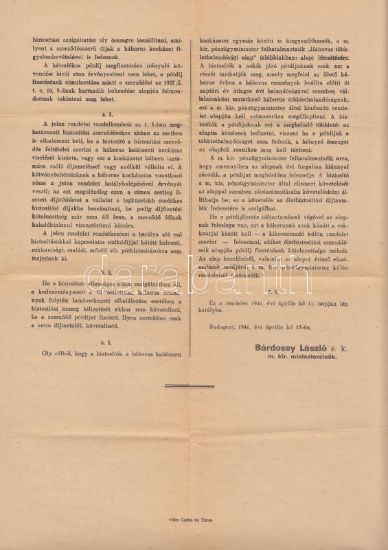 1941 Bárdossy László miniszterelnöki rendelete (2890/1941. M. E. sz.)... https://www.darabanth.com/en/282-Online-auction/282.0/Other-collectibles/Printed-Materials~10/1941-Bardossy-Laszlo-miniszterelnoki-rendelete-28901941-M-E-sz-az-eletbiztositasi-sze~II1456683