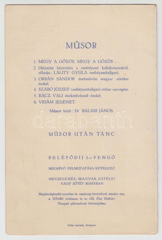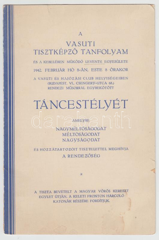 1942 Meghívó a vasúti tisztképző tanfolyam és levente egyesület tánce...