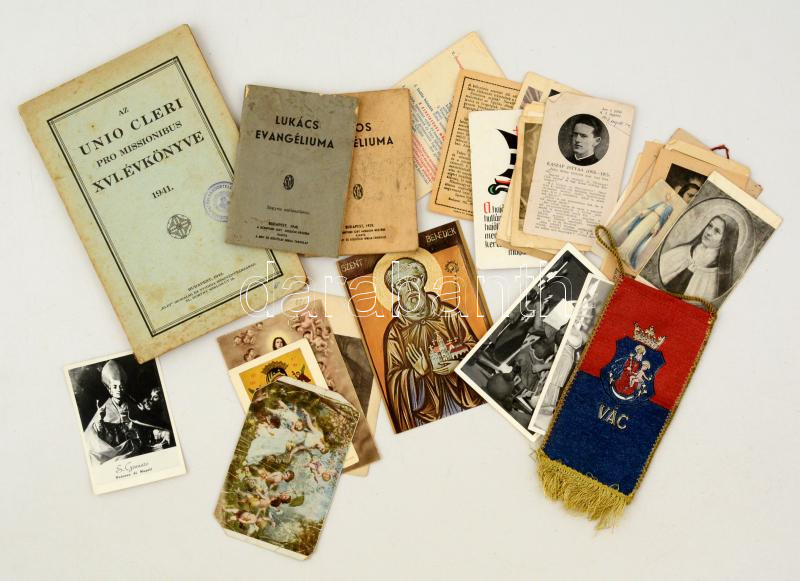 Vegyes kisnyomtatvány tétel: szentképek, évkönyv, közte fotó és zászló is, kb. 20 db