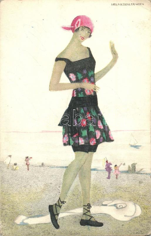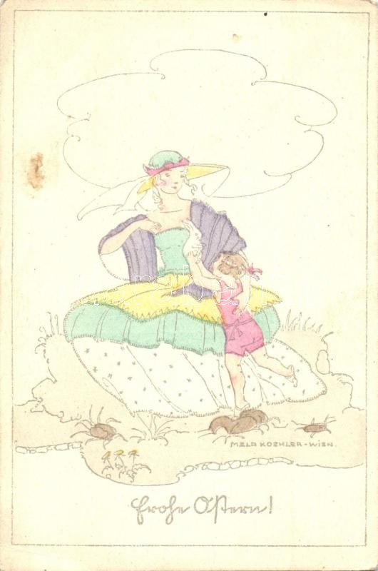 Description: 2 db Wiener művészlap Mela Koehlertől (B.K.W.I. 187-1 & WEAG Nr. 5) / Wiener art postcards, Lady on the beach B.K.W.I. 187-1 & Easter, lady and child with rabbit WEAG Nr. 5, s: Mela Koehler