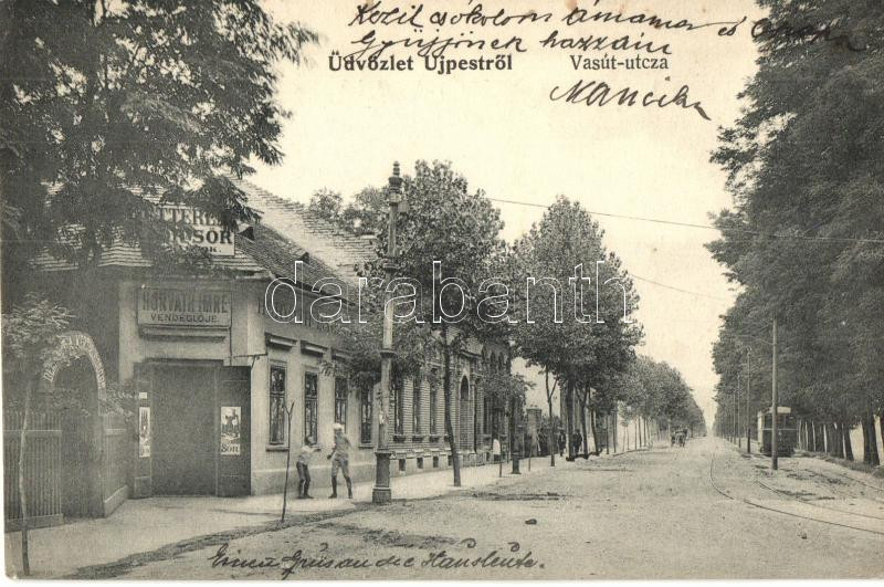 Budapest IV. Újpest, Vasút utca, Horváth Imre vendéglője, villamos