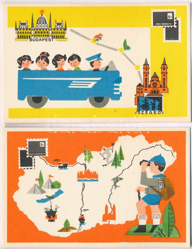 4 db MODERN megíratlan motívumos képeslap; takarékbélyeg reklámlap / 4...