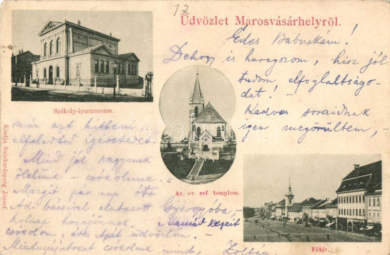 1899 Marosvásárhely, Targu Mures; Székely Iparmúzeum, Református templom, Fő tér, kiadja Reichardsperg József / museum, church, main square