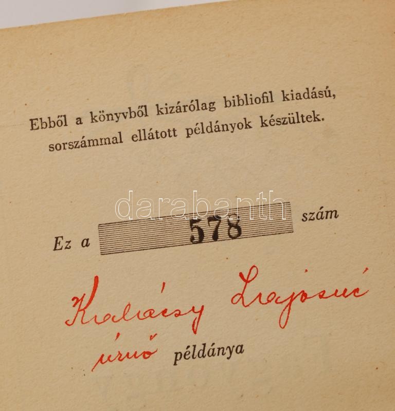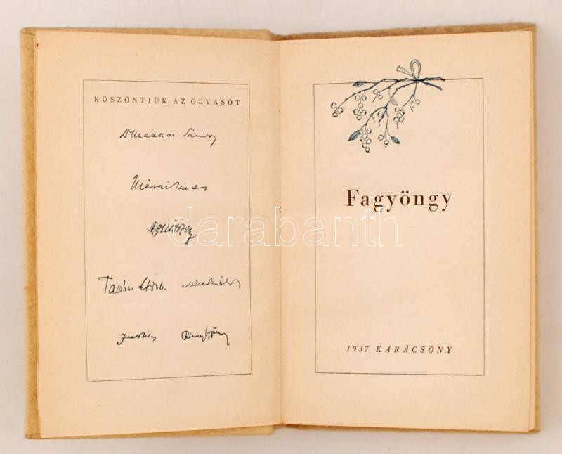 Fagyöngy. 1937 karácsony. Budapest, 1937, Révai nyomda. Nyirő József, Makkai Sándor, Tamási Áron, Mécs László, Tormay Cecile, Kosztolányi, Márai és mások novelláival. Bibliofil kiadás, 578. sorszámozott, névre szóló példány. Kiadói halinakötésben, jó állapotban.