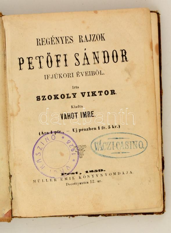 Description: Szokoly Viktor: Regényes rajzok Petőfi Sándor ifjúkori éveiből. Pest, 1859, Vahot Imre, Müller Emil Könyvnyomdája. Átkötött kissé viseltes félvászon kötés, kopottas gerinccel, és borítóval, a Váczi Casino bélyegzőivel.