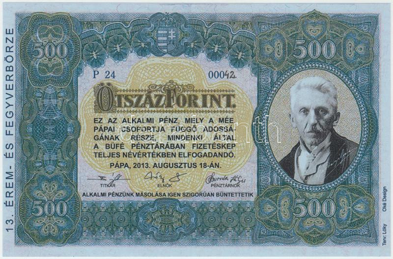 Pápa 2013. "13. Pápai Érem- és Fegyverbörze" 500Ft alkalmi pénz, hátlapján "Magyar Éremgyűjtők Egyesülete - Pápai Csoport 1970" felülbélyegzéssel T:I