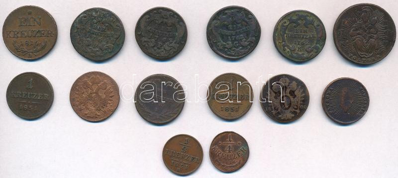 Description: 14db-os vegyes rézpénz tétel, főleg magyar verdejelű krajcárokkal, közte 1765PH-KM Poltúra "Mária Terézia", 1816B 1kr Cu "I. Ferenc", 1851B 1/2kr Cu T:2,2-,3