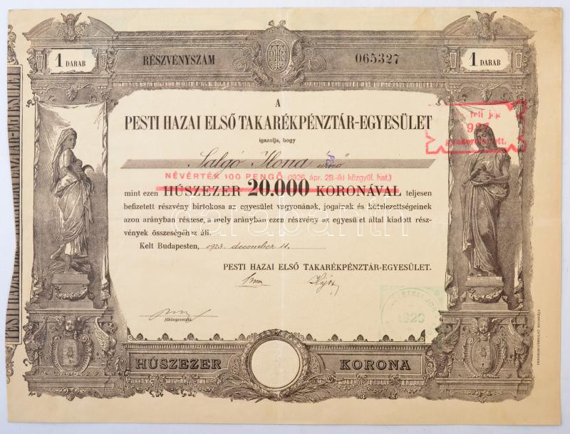 Budapest 1923. "Pesti Hazai Első Takarékpénztár-Egyesület" névre szóló... https://www.darabanth.com/en/283-Online-auction/283.0/Numismatics/Shares-and-Tickets~300005/Budapest-1923-Pesti-Hazai-Elso-Takarekpenztar-Egyesulet-nevre-szolo-reszvenye-20000K-r~II1452873