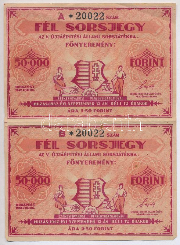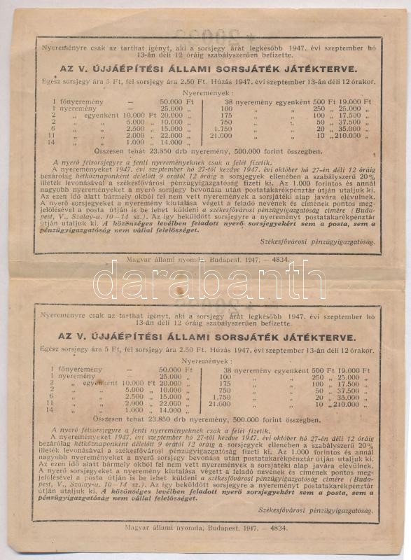 Budapest 1947. "Fél sorsjegy - V. Újjáépítési Állami sorsjáték" "A" és...