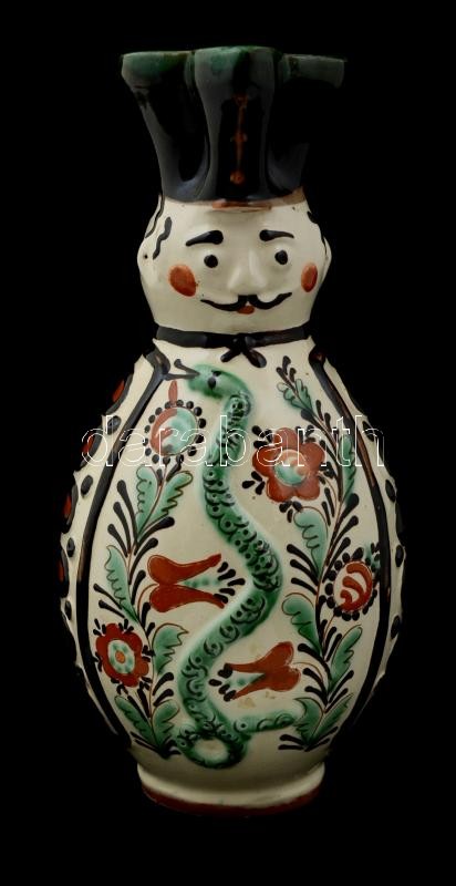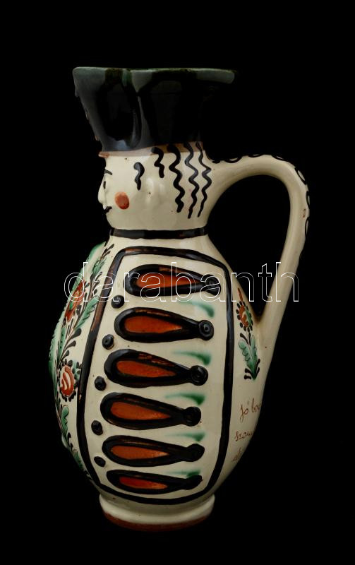 Karcagi Miska kancsó, kézzel festett kerámia, jelzett, minimális lepattanással, m: 27 cm