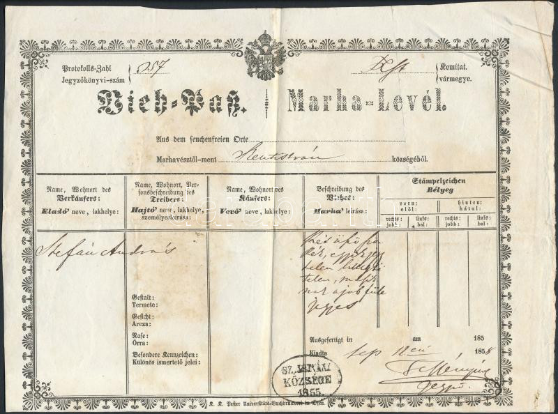 1858 Szentistván, magyar és német nyelvű marhalevél, községi bélyegzővel
