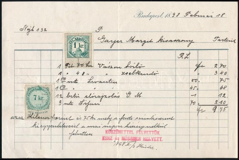 Description: 1898 Budapest, Kígyó tér (Ferenciek tere), Kunz és Mössmer Asztalnemű, vászon- és fehérnemű üzlete a Szép juhásznéhoz; Díszes fejléces számla 8 kr okmánybélyeggel