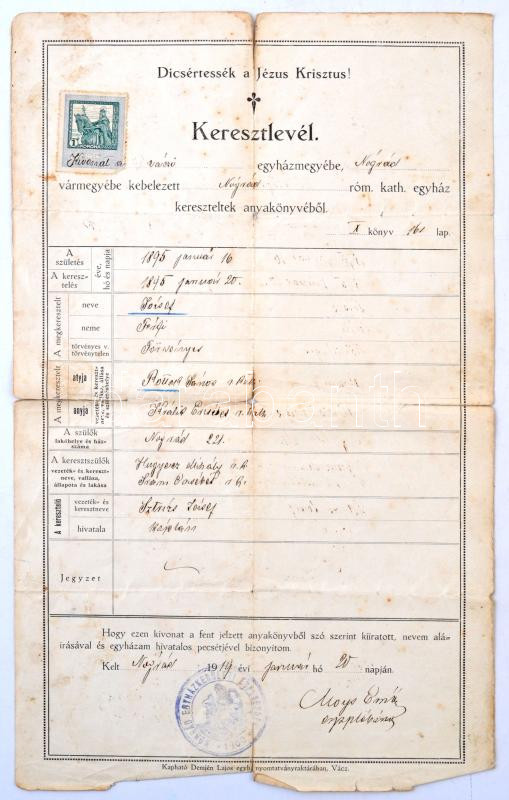 1919 Születési anyakönyvi kivonat Nógrádból, okmánybélyeggel