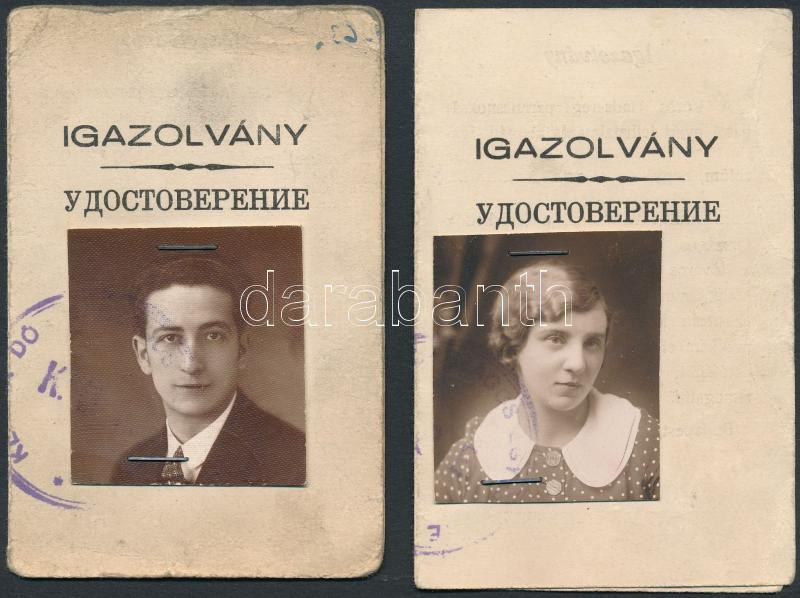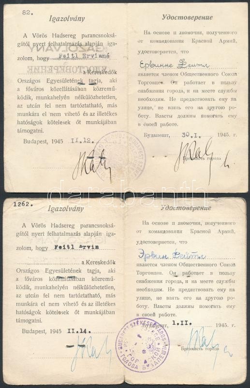 1945 Bp., A Vörös Hadsereg parancsnoksága által kiállított kétnyelvű szabad járást biztosító fényképes igazolvány, 2 db