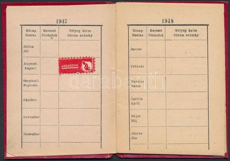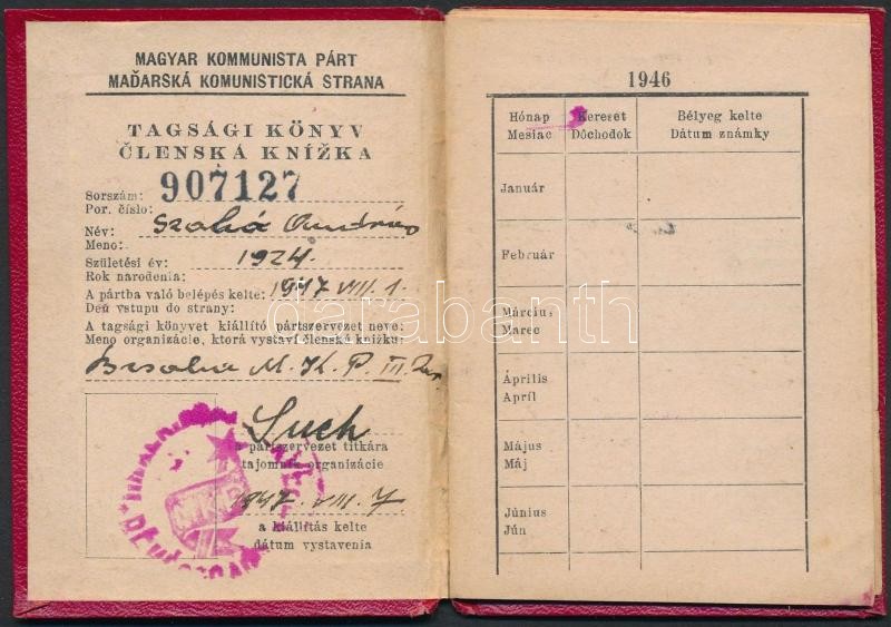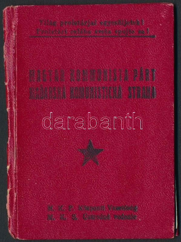 1947 Magyar Kommunista Párt tagsági könyve, magyar és szlovák nyelven, egy bélyeggel, pecséttel, és aláírással./ 1947 Hungarian Communist Party membership card, hungarian and slovak languages, with one stamp, with seal, and signature.