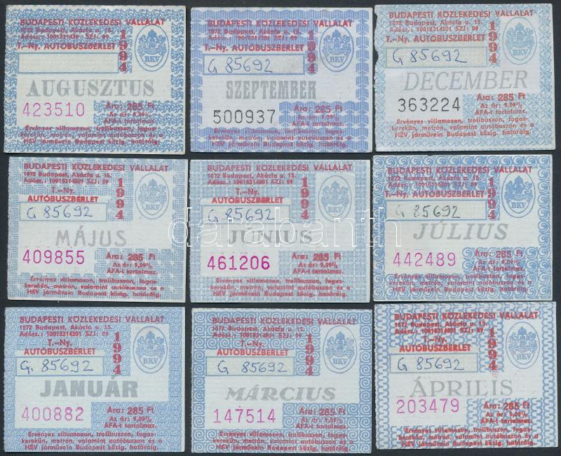 1994 Budapesti Közlekedési Vállalat által kiadott bérletek, 9 db