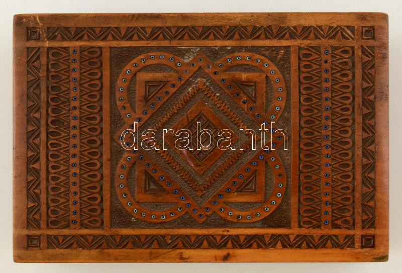 Faragott fa doboz, gyöngyszerű berakással, 15x10x6 cm
