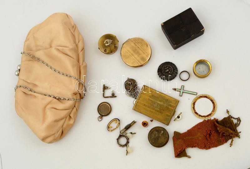Ridikül, benne 15 db különféle női tárgyakkal