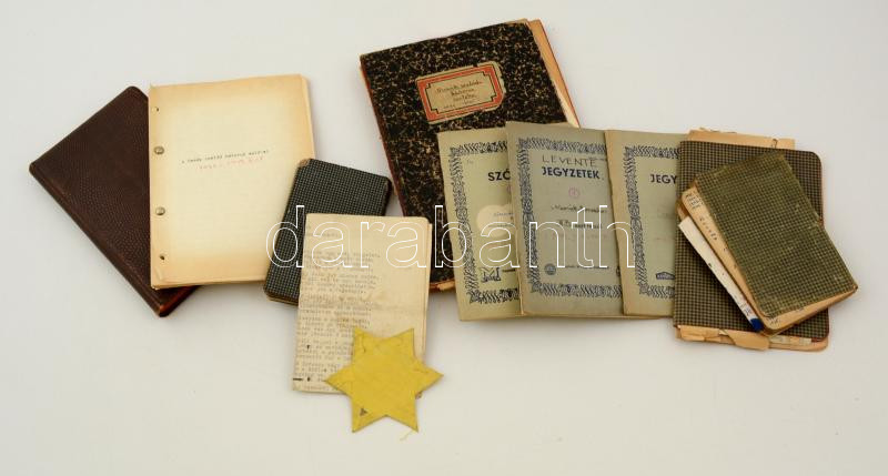 Description: 1938-1946 Egy család háborús naplója. Több kötetnyi kézirat nagyrészt egy fiatal szemszögéből aki a Lágymányoson lakott. A háborús évek, a front és a front utáni élet jeleneteivel. A füzetek mellett egy (talán házilag készített) sárga csillag. Érdekes olvasmány!