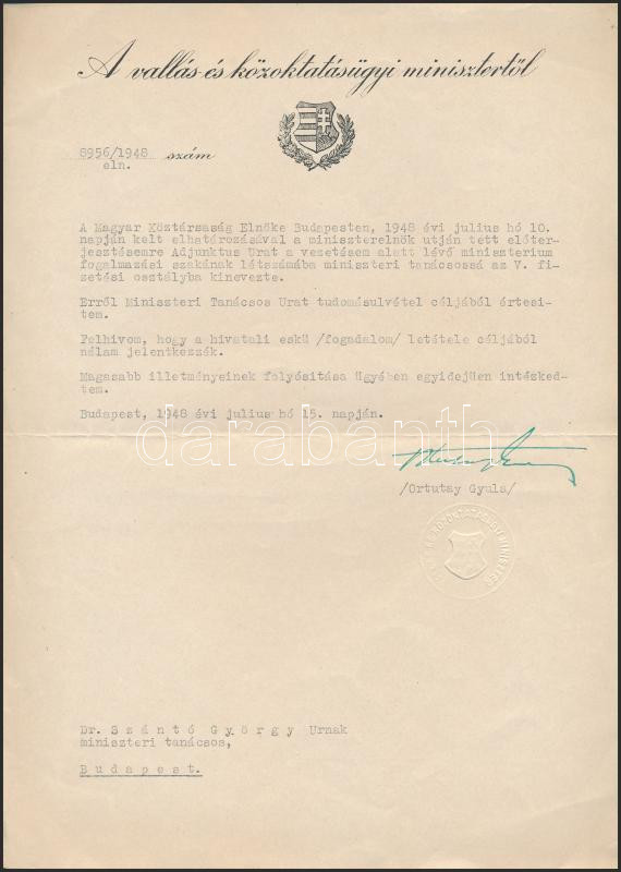 https://www.darabanth.com/en/283-Online-auction/283.0/Other-collectibles/Historical-documents-manuscripts~18/1948-Bp-A-vallas-es-kozoktatasi-miniszter-altal-Dr-Szanto-Gyorgy-szamara-kiadott-minis~II1464384