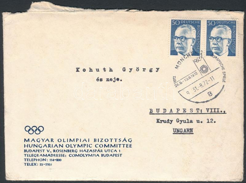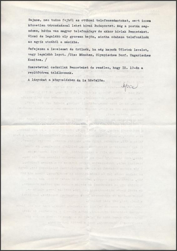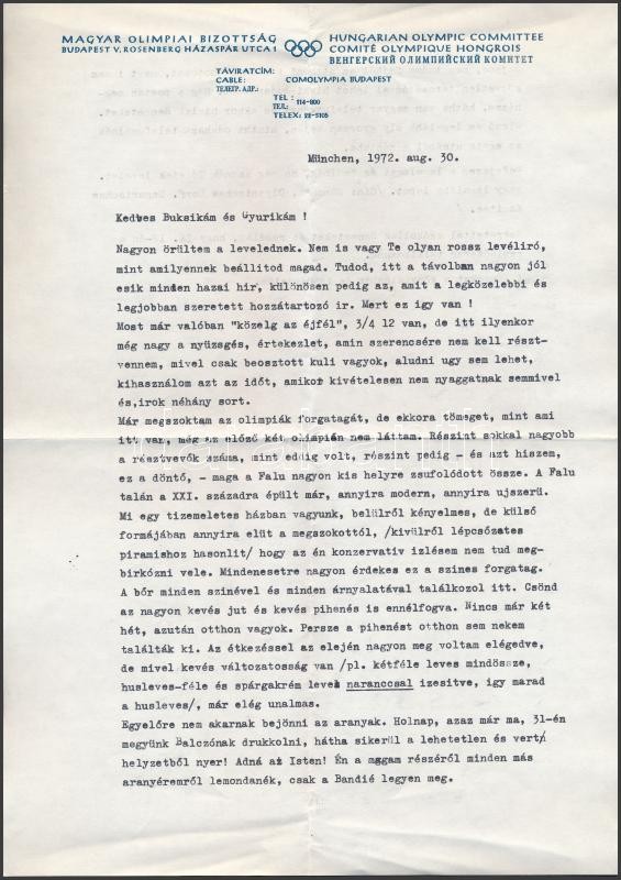 1972 MOB sportvezető másfél oldalas gépelt magánlevele a müncheni olimpiai faluból érdekes részletekkel, eredeti borítékjában / a Hungarian Olympic Committee member's typewritten letter from the Munich Olympics with insightful details (in original envelope)
