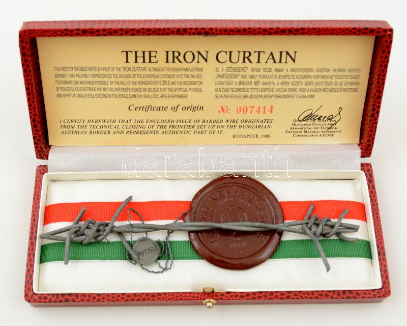 https://www.darabanth.com/en/283-Online-auction/283.0/Other-collectibles/Historical-documents-manuscripts~18/1989-A-Magyar-Osztrak-hataron-huzodo-vasfuggony-egy-darabja-magyar-szalaggal-eredeti-dobozC3~II1463033