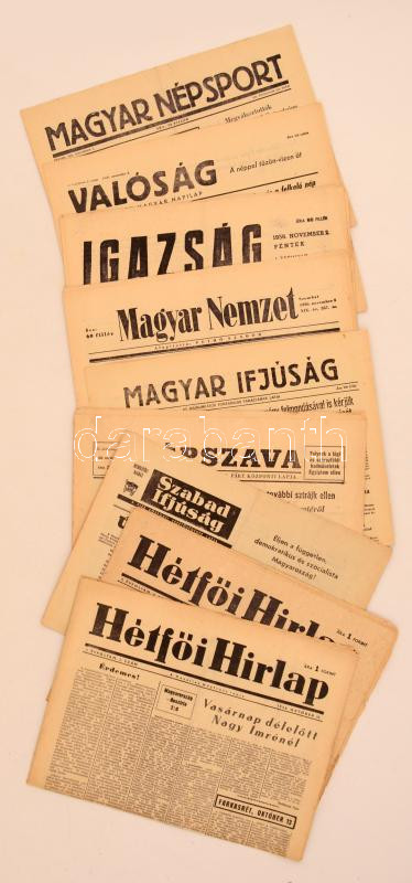 Vegyes 1956-ból származó folyóiratok, Hétfői Hírlap, I. évf., október 15. (2. szám), október 22. (3. szám), Szabad Ifjúság 1956. október 27. Rendkívüli kiadás, Népszava 1956. november 2., Magyar Ifjúság 1956. november 1., Magyar Nemzet 1956. november 3., Igazság 1956. november 2, Valóság 1956. november 2., Magyar Népsport 1956 november 2., összesen 9 szám. Kiadói papírkötésben, változó, többnyire kissé szakadozott állapotban.