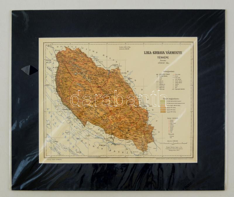 1897 Lika-Krabava vármegye térképe. Tervezete: Gönczy Pál, Bp., Posner Károly Lajos és fia, Pallas Nagy Lexikona, paszpartuban, jó állapotban, 22x28 cm. 1897 Map of Lika-Krabava county, planned by Pál Gönczy, Pallas Nagy Lexikona, in paspartu, in good condition, 22x28 cm.