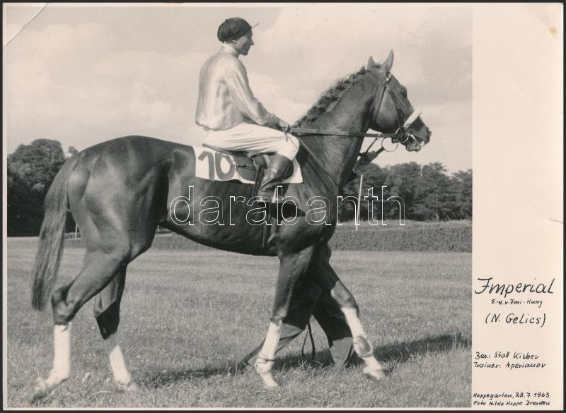 1963 Berlin-Hoppegarten, Imperial a versenyló, Hilde Hoppe Foto, felületén kis szakadással, törésnyommal, feliratozva, 17,5x24 cm