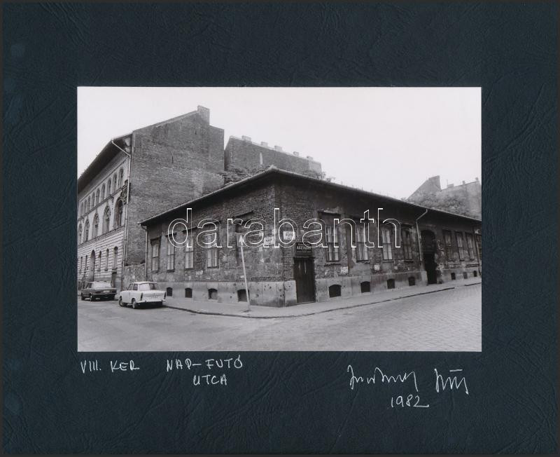 1982 Jankovszky György(1946-): Budapest, VIII. kerület, Nap és Futó utca sarok, feliratozva, aláírt, pecséttel jelzett, kartonra kasírozva, 11,5x17,5 cm