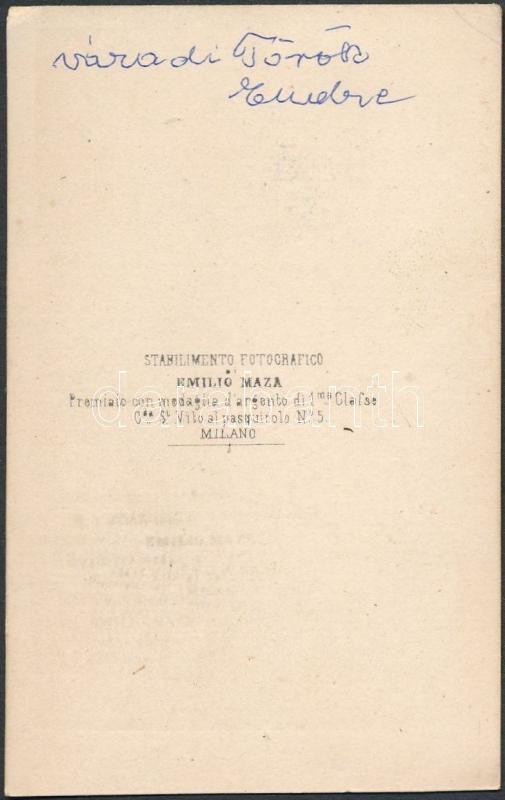 Description: cca 1865 Váradi Török Endre vizitkártya méretű, feliratozott fényképe, Emilio Maza milánói műterméből, a verebélyi Marzsó család fotó hagyatékából, 10,5x6,5 cm