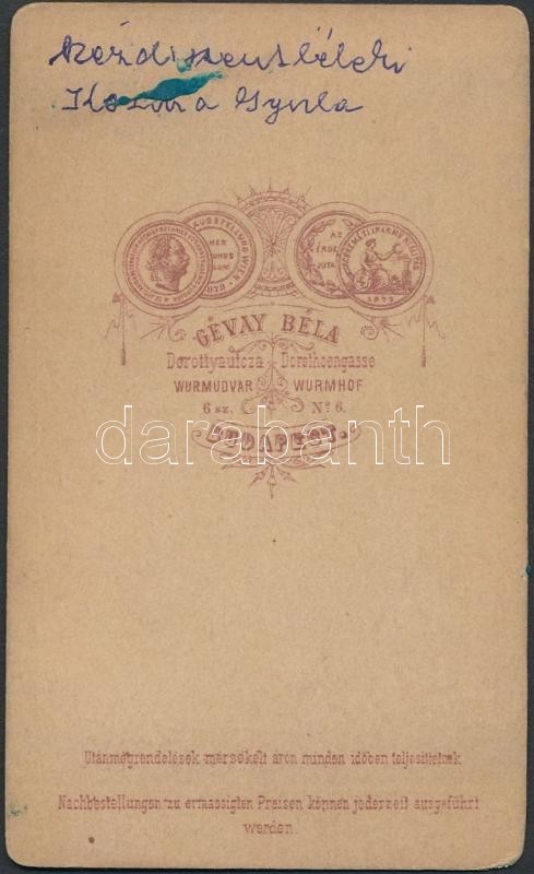 Description: cca 1875 Kézdiszentléleki Kozma Gyula vizitkártya méretű, feliratozott fényképe, Gévay Béla pesti műterméből, a verebélyi Marzsó család fotó hagyatékából, 10,5x6,5 cm