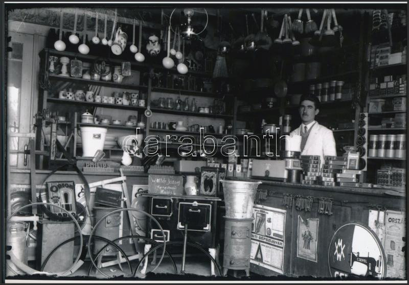 Description: cca 1936 Hajós, Walter József kereskedő boltja, Lőcsei Árpád (?-?) kecskeméti vándorfényképész hagyatékában őrzött vintage üveglemezes negatív mai nagyítása, 18x25 cm