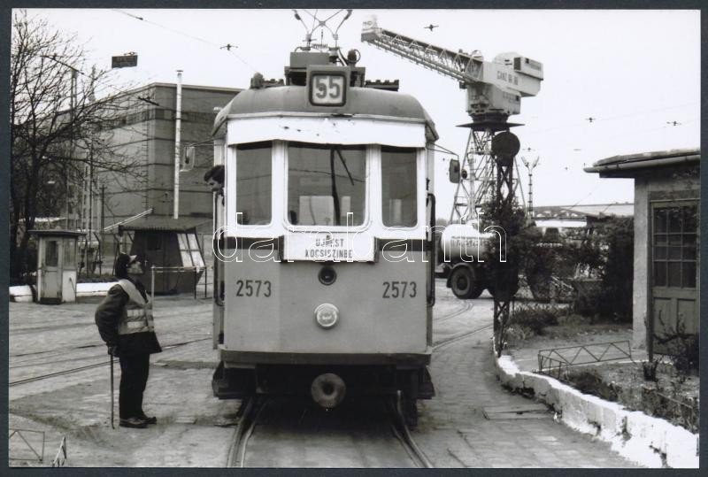 cca 1970 Budapest, Az 55-ös villamos Újpest kocsiszínben, utólagos előhívás, 10x15 cm