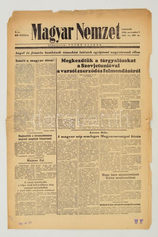 1956 Magyar Nemzet. 1956. november 1., XIX. évf., 255 szám, benne a fo...