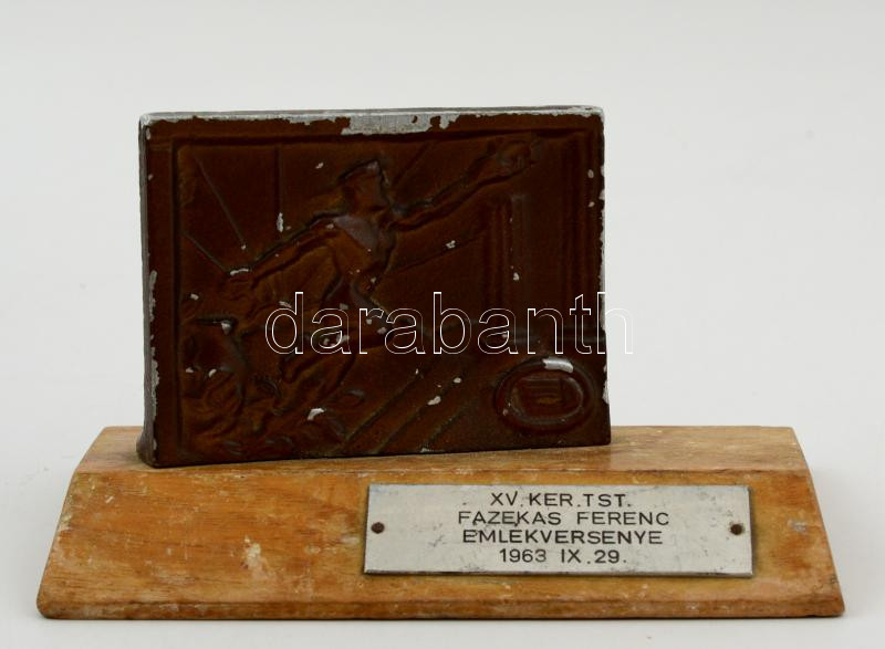 1963 "XV. kerületi tst. Fazekas Ferenc emlékversenye 1963. IX. 29." feliratú fém kisplasztika, fa talapzaton, kopott, m: 9,5 cm