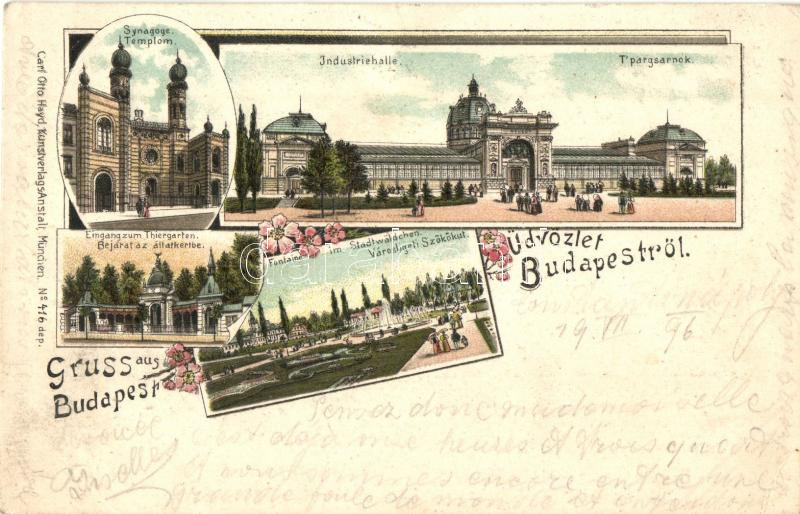 1896 (Vorläufer!) Budapest, Zsinagóga, Iparcsarnok, Állatkerti bejárat, Városligeti szökőkút. Carl Otto Hayd No. 416. floral, litho (Rb)