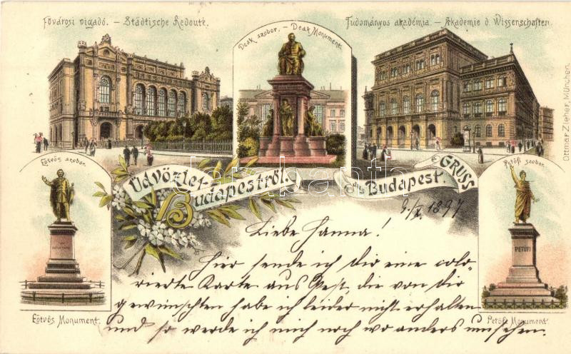 1897 (Vorläufer!) Budapest, Fővárosi Vigadó, Deák, Petőfi és Eötvös szobor, Tudományos Akadémia, floral, litho
