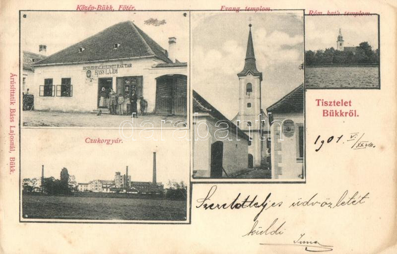 Bük, Bükk; Cukorgyár, Evangélikus és katolikus templomok, Közép-Bükk, Fő tér, Báss Lajos üzlete és saját kiadású lapja