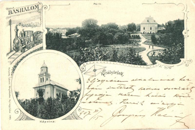 Királytelek-Bashalom, kápolna, park, gőzmozdony. floral Art Nouveau. Hunyady László kiadása (EK)