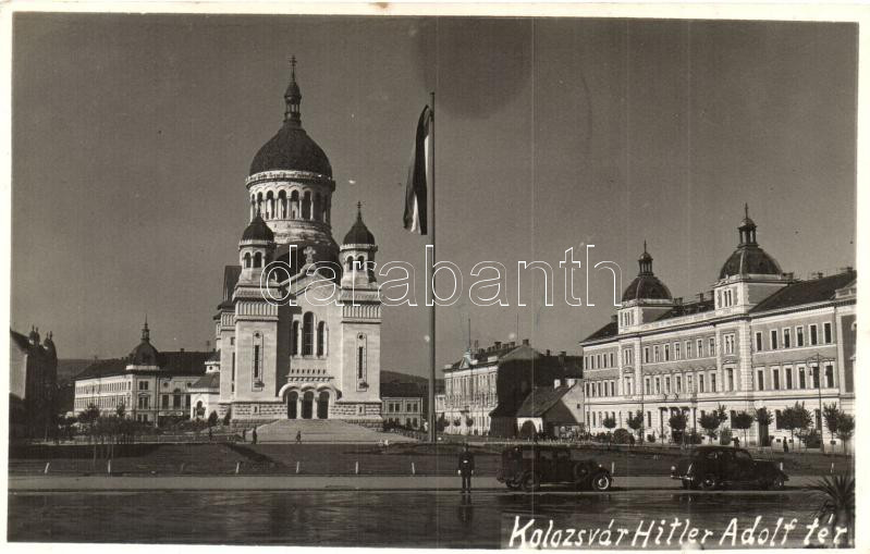 Kolozsvár, Cluj; Hitler Adolf tér, országzászló, templom, automobilok / square, national flag, church, automobiles, 'Kolozsvár visszatért!' So. Stpl, photo (fl)