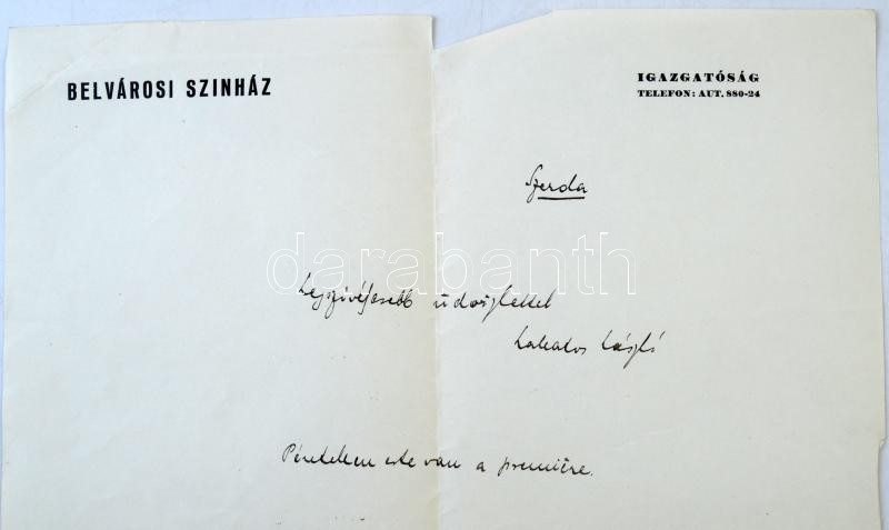 Lakatos László (1882-1944) író, újságíró saját kezű üdvözlő sorai és aláírása a Belvárosi színház levélpapírján