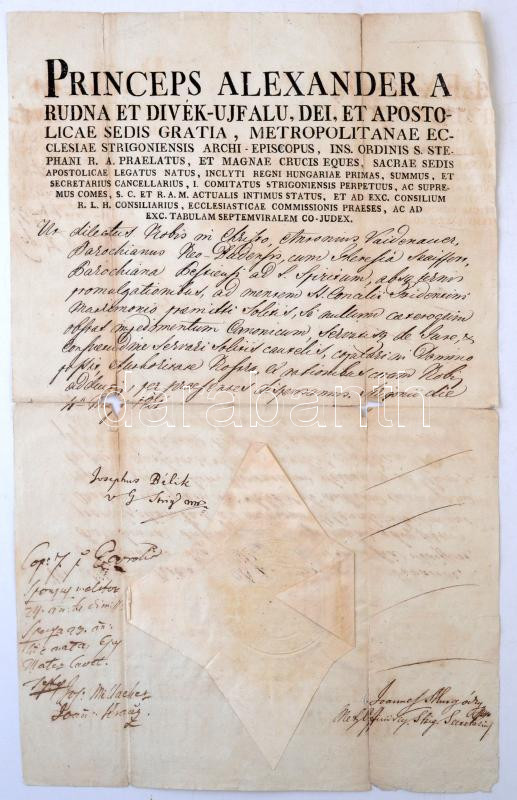 1821 Pest, Rudnay Sándor(1760-1831) esztergomi érsek fejléces papírjár... https://www.darabanth.com/en/284-Online-auction/284.0/Other-collectibles/Documents~16/1821-Pest-Rudnay-Sandor1760-1831-esztergomi-ersek-fejleces-papirjara-irt-hazassagi-engedC3~II1480070